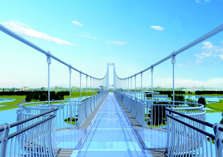 八里河懸空水上觀光玻璃天橋,全長425米,寬3米,全高55米,采用全透明特種玻璃建造,像一條蜿蜒的飛龍盤旋在八里河水面之上。將9D聲光電碎彩屏、花鳥游魚立體特效等流行科技元素與橋面結合震動,同時還有音效。 |