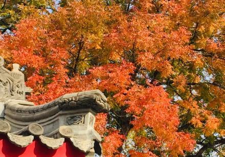 此為八大處一大勝景。霜秋一到,三山之上的黃櫨樹、火炬樹、元寶楓以及柿子樹、核桃樹和山花椒等等,黃時薄山碎,金迎風閃爍,紅時又如二月鮮花處處流丹。有橡樹、青松翠柏,赤橙。
