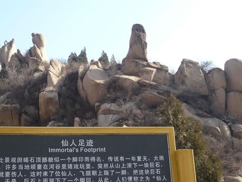 玉兔石:是天然形成的自然風景名勝石,形如一只玉兔俯臥于此。此石形體較大,是鳳凰嶺自然景觀的重要組成部分。據(jù)傳當年嫦娥攜玉兔途經(jīng)此處,將玉兔放在妙峰溝內(nèi)清涼的山泉邊飲水。玉兔看到有幾只野兔在草叢中嬉戲,就忍不住跑過去與它們一起玩耍。玩興大起,忘了時間,此后,玉兔就一直俯臥妙峰溝耐心的等待,等待有一天主人將它接回到月宮仙境。