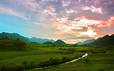 西流晚霞 紅池壩景區(qū)內(nèi)隨處都可觀賞晚霞美景,但最佳地點是西流溪邊海拔2076.3米的廟子包。晚霜灑滿草原,倒映溪中,天、地、人渾然一體,如詩如畫,韻味無窮。