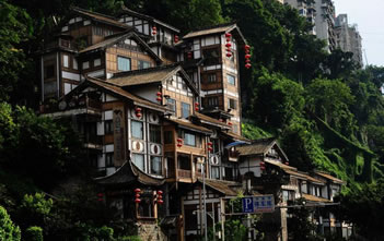 吊腳樓作為西南地區(qū)獨(dú)有的傳統(tǒng)民居建筑,最早可追溯到東漢以前。由于重慶山多,土地緊張,祖先依山就勢(shì),因地制宜,利用木條、竹方,懸虛構(gòu)屋,陡壁懸挑,依山建造出一棟棟樓房。依山、靠崖、臨江是重慶吊腳樓的獨(dú)到之處,洪崖洞吊腳樓建筑群復(fù)原了巴渝古都風(fēng)貌,把古重慶最具特色的吊腳樓、古牌坊、木垂花、懸挑梁、雕刻樓廊、半山街市和青石板路等山地民居集中展現(xiàn)出來,在懸崖峭壁上建成高13層的吊腳樓群,因此被建筑業(yè)界稱為“中華懸崖城”,被中外媒體譽(yù)為“天空之城”。