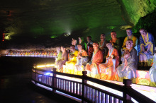 金佛山的天然溶洞星落棋布,以位于機身睡佛肚臍上的古佛洞最為著名,雄大幽深,洞中有山、有河、有壩,洞中有洞,層層交錯;有鐘乳倒垂,形態(tài)怪誕的煙云洞、大寶洞、黑風洞;還有傳說七仙女壩留下的仙女洞;還有直下千尺,幽深險怪的金佛洞;還有老龍洞、明佛洞、桃源洞……故清嘉慶十一年,學者周伯寅在《前游金佛山祀》中寫道:“奇則有蛟龍之宮,有仙圣之館,有木石羽毛之異,有風雪雷雨之靈,而唯其險也,則往往為人跡所不能到此”。