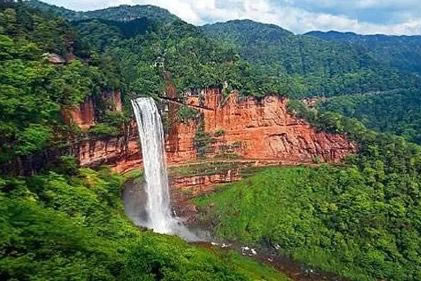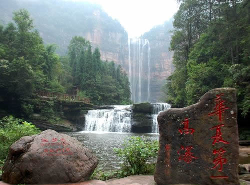 一雄一雌,一南一西,對巖相望,故名鴛鴦瀑布。南瀑高110.82米,為雄瀑,瀑水時而懸垂跌落,時而貼臂滑流;西瀑高90.25米,是雌瀑,瀑水絲絲縷縷,猶如戀人的情絲。雙瀑相望,一路飛珠涌向?qū)Ψ,最后在谷底融為一體,向北而去。
