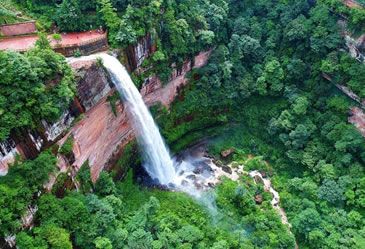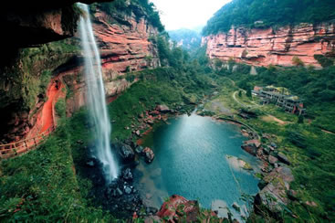 土地巖瀑布在土地巖壁畫對面,如一潔凈的白緞懸垂而下。瀑布高89米,寬25米,懸垂于綠樹紅巖之中,三面赤壁環(huán)繞,與巨幅丹霞赤壁兩相呼應(yīng),形成四山鎖絕谷、一水落幽林、綠樹映湖色、丹霞醉畫屏的絕景。