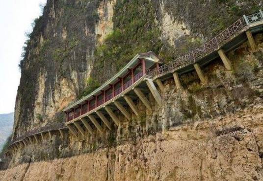 大寧河古棧道遺跡,上下孔眼交錯成倒“品”字,上排兩孔插木樁,鋪木板,下孔插木柱斜撐木板,構(gòu)成三角形支撐架,從而修筑成供人畜行走的“棧道”。 古棧道以寧河為主干,從龍門峽口,經(jīng)巫溪縣延伸到陜西的鎮(zhèn)平縣、湖北溪縣、重慶城口縣一帶。寧河棧道總長約400多千米,其長度超過著名的劍閣棧道,為我國古棧道遺跡中所少有。