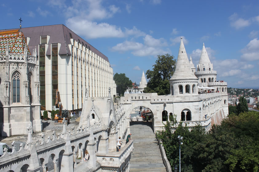 漁人堡 漁人堡(Halászbástya)是一個新哥特式和新羅曼風(fēng)格的觀景臺,位于匈牙利首都布達佩斯布達一側(cè)多瑙河河畔的城堡山,鄰近馬加什教堂。它修建于1895年到1902年之間,設(shè)計師是弗里杰·舒勒克(Frigyes Schulek)。第二次世界大戰(zhàn)期間,漁人堡近乎毀滅。1947年至1948年之間,弗里杰·舒勒克的兒子亞諾什·舒勒克負責(zé)了修復(fù)工程。 如今,城堡的一部分作為餐廳使用;乩壤镉薪^佳的觀景角度,而瑪加什教堂與漁人城堡間的銅像,則是第一位匈牙利國圣·伊斯特萬一世,圣·史迪分國王雕像(King St. Stephen’s statue)圣·史迪分國王是匈牙利第一個天主教國王(公元1000年加冕),同時也可以說是匈牙利國的建立者。漁人堡旁的希爾頓旅館,外層是茶色的帷幕玻璃映照著漁人堡和一旁的教堂倒影,美麗而迷人。 從塔和觀景臺,可以看到多瑙河、瑪格麗特島、東面的佩斯,以及蓋勒特丘陵(Gellért Hill)的全景。