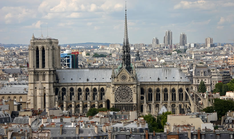巴黎圣母院 巴黎圣母院(法語:Cathédrale Notre Dame de Paris),又名巴黎圣母主教座堂、巴黎圣母院大教堂,位于法蘭西共和國首都巴黎市中心城區(qū),地處塞納河中央西堤島上,與巴黎市政廳和盧浮宮隔河相望,為哥特式基督教教堂建筑;始建于1163年3月24日(羅馬教皇亞歷山大三世四年),是基督教支派天主教巴黎總教區(qū)主教座堂、法國首都最悠久和最具象征意義的紀(jì)念碑之一、歐洲最著名的哥特式大教堂之一、法國最具代表性的文物古跡和世界遺產(chǎn)之一,法國及歐洲文學(xué)文化地標(biāo)建筑。 巴黎圣母院平面為長形馬蹄哥特式拉丁十字形制,總長約127米,總寬約48米,總高達(dá)96米,總建筑面積達(dá)5500平方米,總占地面積達(dá)6000平方米;西立面置有兩座鐘塔,高約69米;內(nèi)部共有五個縱艙,包括一個中艙與兩側(cè)各兩個的翼艙,十字的頂部是祭壇,十字長翼是圣母院長方形主殿;東端是圣壇,后為半圓形的外墻,橫廳兩個盡段都有開門,旁置小塔;圣壇外有標(biāo)志性尖塔,高96米。巴黎圣母院是世界上第一座完全意義上的哥特式教堂,建筑本體的雕刻藝術(shù)和繪畫藝術(shù)及堂內(nèi)珍藏的大量藝術(shù)珍品具有極高的歷史文化價值和蜚聲中外的世界聲譽,是法國巴黎的象征,世界主流宗教基督教圣地。