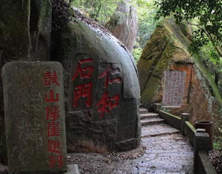 第四亭:“半山亭”。由第三亭至此,共有494級臺階。亭在半嶺,故名。過此亭百余階,有石刻“路通仙苑”,轉(zhuǎn)小徑可達(dá)“十八洞景”。“半山亭”后近300階有石刻“桃?guī)r洞口”,往東可到桃?guī)r洞,桃花精舍。