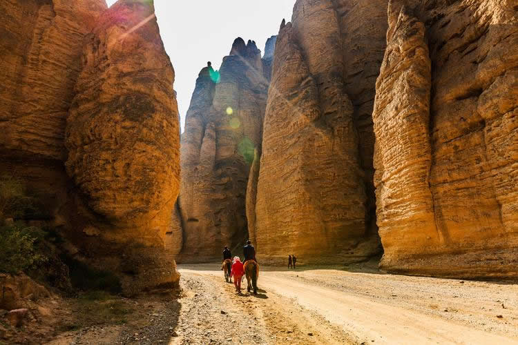 這里的石柱石筍大多高達(dá)八十至一百米之間,最高達(dá)二百多米,均由橘黃色砂礫巖構(gòu)成,鬼斧神工,猶如雕塑大師之夢(mèng)幻杰作。我們左行至飲馬溝入口,換乘當(dāng)?shù)剞r(nóng)民裝扮得極富民俗風(fēng)情的驢車前行。進(jìn)入峽谷,兩邊布滿了巨大的石筍、石人、石鐘、石崖、石窟,峰回路轉(zhuǎn),步移景變,人們將石景命名為:大象吸水、千帆競(jìng)發(fā)、伴侶駝、“黃河母親”等等,其形神兼?zhèn)洌蜩蛉缟?/p>