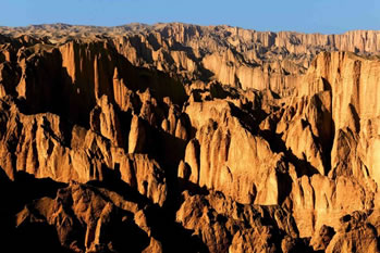 石林則依著黃河的彎轉(zhuǎn),藐著黃河的水流,這個(gè)場(chǎng)面保持著一種驚心動(dòng)魄的興奮,一看就是飛逝而去的千萬(wàn)年啊,千萬(wàn)年。老龍灣像一條長(zhǎng)長(zhǎng)的、波光粼粼的跑道,黃河拍打著細(xì)浪,從聳立的石林中,陡峭的巖石旁流過(guò)去,固執(zhí)地向干涸遙遠(yuǎn)的北方挺進(jìn)。風(fēng)吹過(guò),水涮過(guò),千萬(wàn)年的歲月,靈動(dòng)和冥想,一路歌舞狂歡。突然一剎那就是永恒。停在那里回轉(zhuǎn)的頭型,飄飛的發(fā)絲,閃逸的裙裾一下子被動(dòng)結(jié)了,面目間的笑意還沒(méi)有來(lái)及抹去。假如有一天,您也來(lái)到石林,是否會(huì)為這一片晴朗而遼闊的天空下毫無(wú)造作、天然凝就的靈魂而感動(dòng)和震撼?大自然的神筆飛揚(yáng),你縱然放開(kāi)想象,馳騁神思。望尖銳或圓錐狀的山峰,基部相連的簇狀,是石林發(fā)育地貌形態(tài)。只要能夠聯(lián)想到的物象,毫無(wú)例外活生生矗立在你的眼前,仰觀景慕,活靈神現(xiàn);你沒(méi)有想到的也一幕幕向你襲來(lái),目不暇接。山峰如聚,峰嶺沸騰了一般,黃河石林以它非石非巖的特質(zhì),在這塊土地上托起一個(gè)立體的神話。雅丹、丹霞、峰林為一體的地貌奇觀寫意了恢弘的場(chǎng)景,刀鋒擁擠,千軍涌動(dòng),萬(wàn)馬奔騰,這儼如一個(gè)拼殺的戰(zhàn)場(chǎng),風(fēng)行走其間鼓動(dòng)著金屬碰撞的鏗鏘,它不再是一個(gè)夸張的舞臺(tái),場(chǎng)面不再是一個(gè)宏大的舞池。穿越石林,我們不自主地感知黃土高原的陽(yáng)剛的軀身,緘默的神態(tài),堅(jiān)毅的面容,它在風(fēng)雨中矗立,日復(fù)一日,從不愿放棄對(duì)大地的眷戀,對(duì)太陽(yáng)的向往。