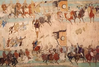 敦煌作為中西交通的樞紐,在壁畫上不僅留下了商旅來(lái)往的活動(dòng)情況,還留下了寶貴的交通工具的形象資料。他們有牛馬駝騾、驢象舟船、車轎輿輦等。常用的交通工具車輛類型各異,牛車有“通牛車”、“偏牛車”、敞篷牛車,馬車有駟車、駱車,還有駱駝車、童車、獨(dú)輪車等,特別是保存了中國(guó)為世界交通做出獨(dú)有貢獻(xiàn)的獨(dú)輪車、馬套挽具(胸帶挽具和肩套挽具)、馬蹬、馬蹄釘掌等珍貴的圖像數(shù)據(jù)。西魏第285窟、北周第296窟五百盲賊皈依故事畫,表現(xiàn)了騎著戰(zhàn)馬的騎兵,與身穿褲褶的步兵(強(qiáng)盜)作戰(zhàn)的場(chǎng)面,畫面上畫出了馬鎧,它是保護(hù)戰(zhàn)馬的防護(hù)裝備,古稱具裝,或具裝鎧。第285窟馬鎧的形制齊全,從保護(hù)馬頭的“面簾”、到保護(hù)馬鞍后尻部的“寄生”一應(yīng)俱全。反映了漢代已有的具裝,到北朝時(shí)期已發(fā)展為玩唄成熟的保護(hù)裝備。馬鎧的產(chǎn)生和發(fā)展是中國(guó)為世界軍事裝備所作的獨(dú)有貢獻(xiàn)。