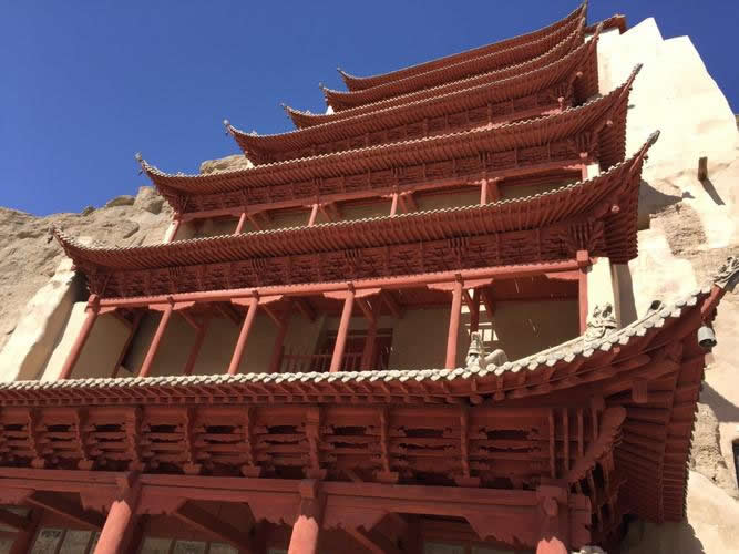 此上下三層洞窟似為吳和尚獨(dú)力開(kāi)鑿的系列窟。主室為莫高窟面積最大之洞窟。室內(nèi)馬蹄形中心佛壇上,存清代改修之宋塑九身,壇西沿背屏直接窟頂,繪唐及宋畫。四壁壁畫為重層,表層為西夏時(shí)所繪綠底千佛,色調(diào)單一,形象如出一模,缺乏生氣。1981年敦煌文物研究所整修此窟壁畫時(shí),曾發(fā)現(xiàn)底層晚唐壁畫,該畫色彩鮮麗如新,線條清晰,似為某種經(jīng)變凈土說(shuō)法圖中的水榭雕欄,以此可窺未變色的晚唐畫之一斑。窟頂為西夏浮塑貼金的團(tuán)鳳四龍?jiān)寰,四披為貼金棋格團(tuán)花圖案。甬道兩壁繪西夏說(shuō)法圖及供養(yǎng)菩薩,南壁中部嵌清代《重修千佛洞三層樓功德碑記》木碑一方,北壁中部為藏經(jīng)洞窟門。前室無(wú)畫。洞窟編號(hào)第16~17號(hào),16窟建于唐大中五年至咸通(851~867)間?咔耙醒陆y(tǒng)建三層木構(gòu)窟檐,故俗稱“三層樓”,為清光緒三十二年(1906年)王道士主持修建,王道士于16窟甬道北側(cè)發(fā)現(xiàn)藏經(jīng)洞,后編號(hào)為第17窟。因此三層樓也是為數(shù)不多的窟中窟。