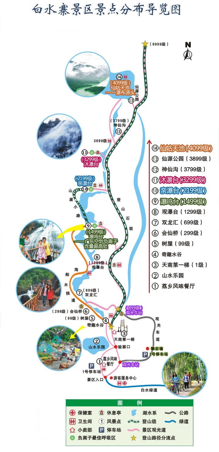 白水寨圍繞白水仙瀑及奇峰秀色,建有9999級(jí)登山步徑,總長(zhǎng)6.6公里,19000多步,橫跨三座高山,邊接二大天池,號(hào)稱“天南第一梯”,取“勝境尋仙”、“悠閑怡景”、“知難而上”、“勇士進(jìn)取”、“登高攬勝”和“登峰如愿”之義,分“尋仙、怡景、知難、攬勝、勇士和登峰”六段梯,拾級(jí)而上盡覽天南第一梯奇觀,盡享休閑健身觀光之樂,百般風(fēng)情皆可體驗(yàn)。走過六段梯,登上9999,心想事成,強(qiáng)身健體,六六大順,長(zhǎng)長(zhǎng)久久。