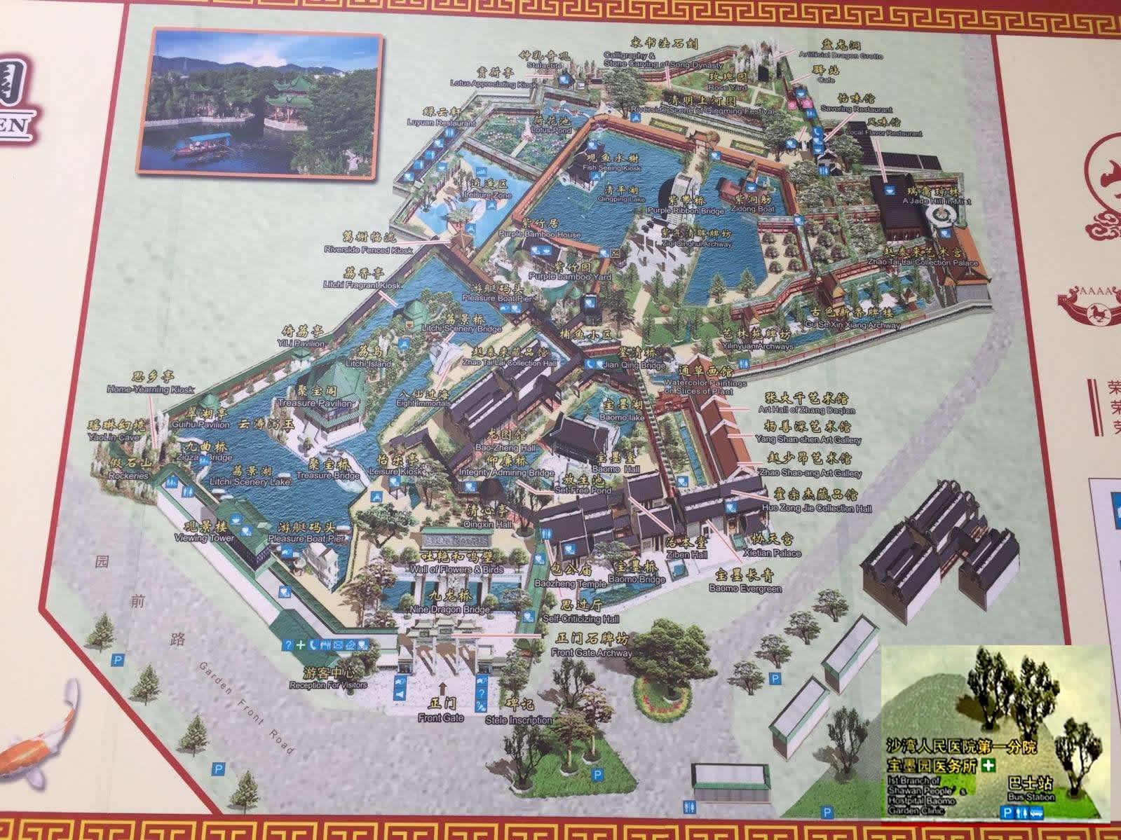 寶墨園內(nèi)共有治本堂、寶墨堂、清心亭、仰廉橋、紫洞舫、龍圖館、千象回廊和風味食街這8大景區(qū),40多個景點,30多座石橋,河湖眾多,流水縱橫,建筑、園林、山水、石橋。陶塑、灰塑、石雕、磚雕、木雕、石刻、彩繪、嵌瓷等藝術(shù)精品琳瑯滿目,各展館珍藏、陳列了大批文物古董和名家的書畫。