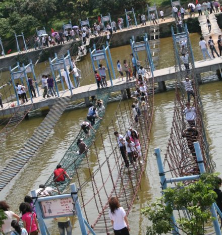 拓展訓(xùn)練基地占地面積10余畝,是深圳市青少年生存能力素質(zhì)教育基地,分為水上游樂(lè)區(qū)、高空拓展區(qū)與兒童游樂(lè)區(qū)。特別是水上游樂(lè)區(qū)涵蓋了霹靂滾桶、魔鬼車輪、木樁功夫橋和鐵鎖吊橋等有趣刺激拓展運(yùn)動(dòng)項(xiàng)目。您既可以在青山綠水中盡情呼吸新鮮空氣,又可以在動(dòng)感十足的拓展項(xiàng)目中挑戰(zhàn)自我,體驗(yàn)這一風(fēng)靡全球的拓展運(yùn)動(dòng)帶給你的無(wú)限快樂(lè)。項(xiàng)目網(wǎng)羅: 霹靂滾桶、魔鬼車輪、秋千橋 、連環(huán)獨(dú)木橋 、木樁功夫橋、 空中獨(dú)木橋、園木云梯橋、鐵鎖晃橋、長(zhǎng)板坡 、 云梯橋 、鐵鎖鋼絲橋 、天羅地網(wǎng)、云梯功夫橋 、鐵鎖吊橋、 木樁功夫橋、水上漂 、鐵鎖橋、 一線鐵鎖橋 一線鐵鎖橋 、九曲獨(dú)木橋 、踏水無(wú)痕 、向風(fēng)起舞 、鐵甲四強(qiáng)等。