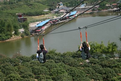 空中飛人滑索項(xiàng)目位于觀音廟后,依山勢(shì)而建,在果樹(shù)山林之間架起了一段全程300米、落差50米,每秒7.5米滑行速度的高空索道,在歷時(shí)40秒滑行時(shí)間中,游客在享受高空索道帶來(lái)驚險(xiǎn)刺激體驗(yàn)同時(shí),可一覽園區(qū)秀美風(fēng)景并,讓人回味無(wú)窮。