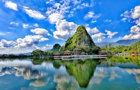 七星巖以喀斯特溶巖地貌的巖峰、湖泊景觀為主要特色,七座排列如北斗七星的石灰?guī)r巖峰巧布在面積達(dá)6.3平方公里的湖面上,20余公里長(zhǎng)的湖堤把湖面分割成五大湖,風(fēng)光旖旎。被譽(yù)為“人間仙境”、“嶺南第一奇觀”。