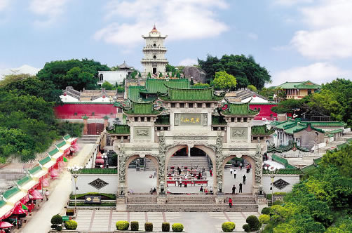 海豐蓮花山度假村(AAAA級旅游景區(qū))位于汕尾市海豐縣城北部7千米處,主峰海拔1337.3米,為粵東沿海第一高峰,狀如一朵盛開的蓮花,故名蓮花山。南麓坡面上,層巒疊嶂,翠綠相間,堆疊而起,層次分明,形成“蓮峰疊翠”的天下奇景。境內(nèi)云霧繚繞,森林密布,生長著仙人茶、羅漢松、白木香、胭脂木等珍稀植物;飛瀉著玉龍噴須、三井回音、龍?zhí)讹w瀑、七星疊瀑、雙龍瀑、回音瀑等18處瀑布;分布著召貢、埔仔等溫泉及大、小東門、天池、如來盤石等自然景觀,具有雄、奇、險、秀、幽之特色,是廣東省的四大名山之一。明清時期,有高僧在此創(chuàng)建雞鳴寺、云蓮寺、金竹寺等7座古剎,宗教文化發(fā)達,被譽為“蓮花佛國”。歷來有白玉蟾、劉克莊、文天祥、丁日昌等名人在此隱居或經(jīng)過,寫有贊美的詩篇。近代有周恩來、彭湃、徐向前、古大存等在此開辟和建立革命武裝根據(jù)地,留下紅四師師部遺址等。1995年3月,經(jīng)廣東省林業(yè)廳批準,建立廣東蓮花山森林公園。