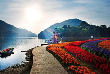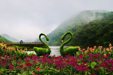 “七彩天池”花海是石灶風(fēng)光區(qū)的天池花海景點(diǎn)國慶期間的一個(gè)特色,由多種顏色的花卉共同組成。大紅色的一串紅、金黃色的硫化菊、紫色的千日紅、橙色的百日草、深紅色的紅穗冠、淡黃色的黃穗冠和粉色的朱唇等匯聚成一道亮麗的彩虹,降落在藍(lán)天碧水之間,創(chuàng)造出一個(gè)七彩斑斕的童話世界。同時(shí),圍繞著這七色花海還有大波斯菊與醉蝶花。紅的,粉的,紫的,白的小花配以音樂等元素造型共同點(diǎn)綴著這幅優(yōu)美的畫卷。“七彩天池”最佳觀賞期為9-11月。