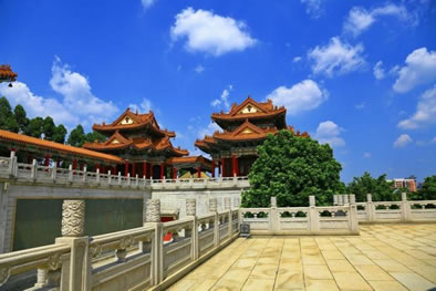 三清殿東南邊這座三層綠色琉璃蓋頂的半仿古大樓,稱太和樓,二樓大廳是中華民族館,反映中國56個民族的居住地,民俗和穿戴的服飾。三樓大廳是雅石館,館內集天下之奇石。所謂奇石,就是自然生成形狀奇怪的石頭,例如其中一塊菊花石,就是花都區(qū)花山鎮(zhèn)的特產。這石頭無論敲成多少塊,滿身都是菊花形狀,白色半透明。花都區(qū)區(qū)花是菊花,是源于特產菊花石寓意。山門、山門牌坊門、廣場(兩側為鐘樓、鼓樓,各立一華表)、三清大殿(采用傳統(tǒng)的天壇形式建造,殿頂的巨大圓球以純金制成)為觀的中軸建筑。該觀整體建筑以仿古“天壇”形式建造,氣派莊嚴,四周環(huán)境雅致,素有廣東“小天壇”之稱。 |
