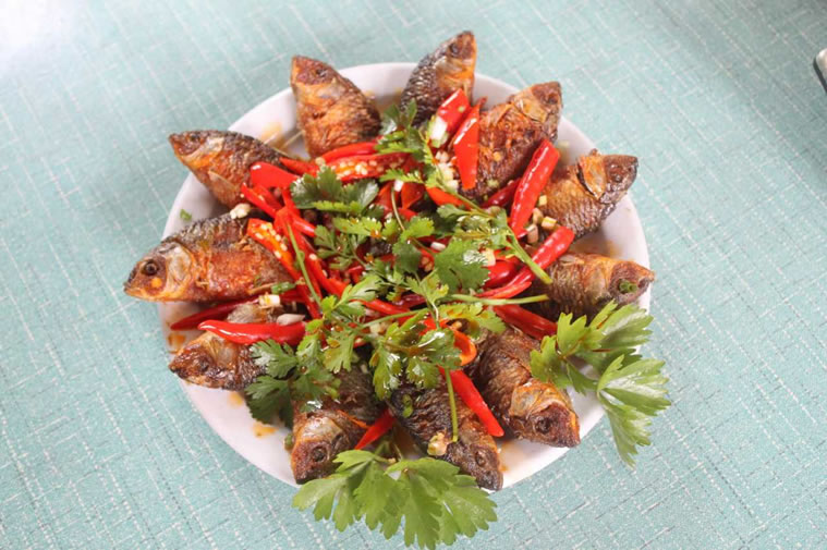 全州禾花魚 全州禾花魚,為長時期稻田放養(yǎng)馴化選育品種,因食水稻落花而得名。最遠(yuǎn)可追溯至漢代,唐昭寧年間,劉恂在《嶺表錄異》中有詳細(xì)文字記載。乾隆時成朝廷貢品,譽(yù)滿京城。禾花魚年產(chǎn)兩次,總產(chǎn)量1000噸左右,以重約1兩至2兩,長約2至3寸為宜。有青蒸、水煮、紅燜、油炸、煎、火烤、煙熏等十余種吃法。