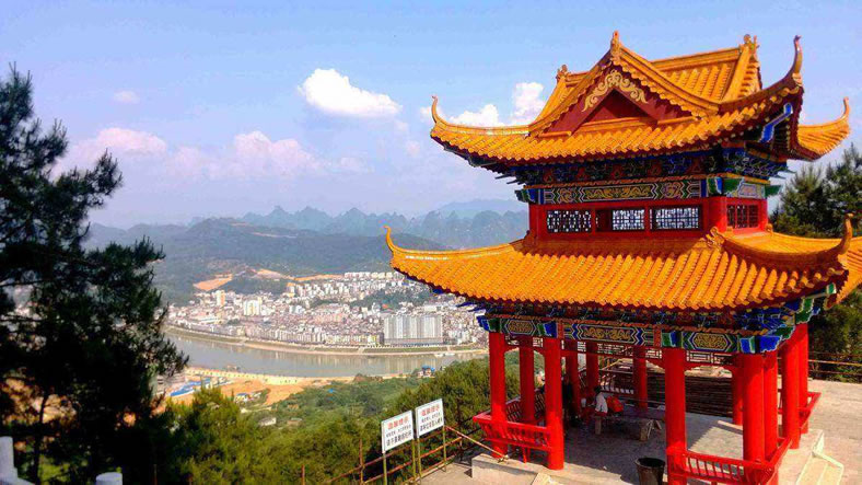 金子嶺位于漓江、荔江、茶江匯合處,與平樂(lè)縣城相對(duì)高度約600米。金子嶺觀(guān)景閣建筑風(fēng)格為南派大翹角多角式樓閣建筑,建設(shè)采用鋼筋混凝土現(xiàn)代建筑材料,仿明清時(shí)代大木結(jié)構(gòu)手法制作,主閣樓總高度44.83米,外觀(guān)結(jié)構(gòu)為五層,內(nèi)部結(jié)構(gòu)為九層,總建筑面積為2134.05平方米,其中底層建筑面積為813.43平方米。