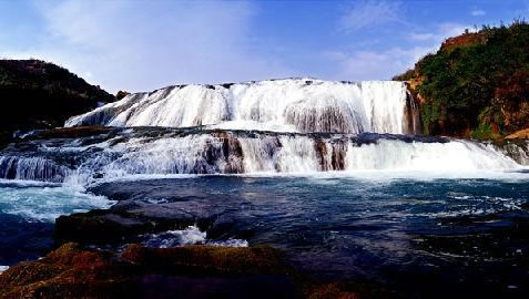 “遙聞水聲轟轟,從隴隙北望,忽有水自東北山腋瀉崖而下,搗入重淵,但見其上橫白闊數(shù)丈,翻空涌雪,而不見其下截,蓋為對崖所隔也!边@是徐霞客在《徐霞客游記》中對陡坡塘瀑布的描述。陡坡塘瀑布因1985年曾在該瀑布拍攝電視連續(xù)劇《西游記》序曲《敢問路在何方》中,唐僧師徒四人牽馬過河的場景而聲名遠播。