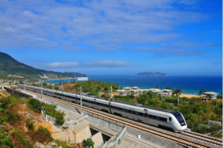 環(huán)島鐵路:海南環(huán)島鐵路由海南東環(huán)鐵路和海南西環(huán)鐵路組成,連接?谥寥齺啠瑬|環(huán)308千米,西環(huán)345千米,主要運(yùn)行動(dòng)車組,是全球首條環(huán)島高鐵。它的建成,將有利于優(yōu)化產(chǎn)業(yè)布局,帶動(dòng)縣域經(jīng)濟(jì)協(xié)調(diào)發(fā)展;高鐵牽引動(dòng)力為電力,沒有廢氣排放,能源消費(fèi)量低,對(duì)海南建設(shè)生態(tài)省和節(jié)約型社會(huì)將發(fā)揮積極作用;大大完善海南旅游基礎(chǔ)設(shè)施,滿足海南國(guó)際旅游島不斷增長(zhǎng)的運(yùn)輸需求,為海南建成世界級(jí)海島休閑度假旅游勝地提供有力支撐。