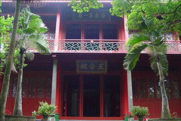 五公祠位于國興街道海府路169號,是為紀(jì)念唐宋時(shí)期貶謫到海南的五位著名歷史人物:唐朝名相李德裕、宋朝名相李綱、李光、趙鼎、名臣胡詮而建的,故名五公祠,現(xiàn)為全國重點(diǎn)文物保護(hù)單位。 五公祠為一組古建筑群的統(tǒng)稱,它由海南第一樓、觀稼堂、學(xué)圃堂、東齋組成,并和蘇公祠、兩伏波祠及其拜亭、洞酌亭、粟泉亭、洗心軒、游仙洞等連成一片,建筑面積2800余平方米,連同園林、井泉、池塘約占地100畝。始建于明萬歷年間,清光緒十五年(1889年)重修,后又多次修繕,現(xiàn)仍是熠熠生輝。