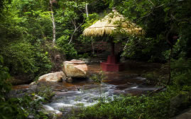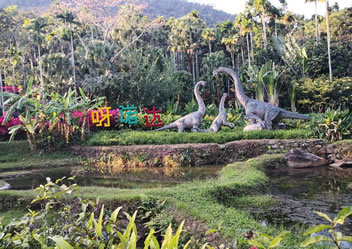 蘭花溪將中國(guó)傳統(tǒng)造園技巧與熱帶雨林文化進(jìn)行結(jié)合,附近有花草、茅草屋、徒步小道,長(zhǎng)藤下分布有樹(shù)桌椅。