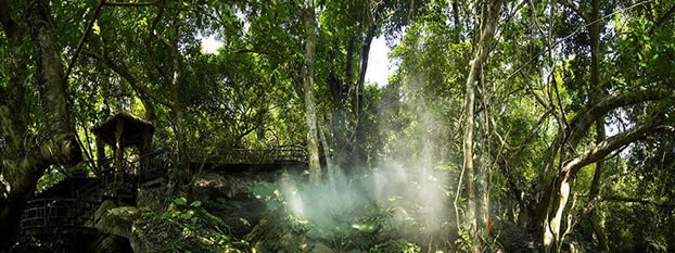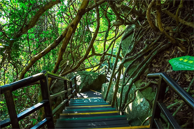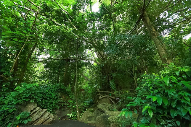 雨林谷以展現(xiàn)原生態(tài)的熱帶雨林景觀為核心,匯集參天巨榕、百年古藤、黑桫欏、仙草靈芝、見(jiàn)血封喉、野生桄榔以及“高板根”“根抱石”“空中花園”“老莖結(jié)果”“植物絞殺”“藤本攀附”熱帶雨林的六大奇觀等。雨林谷是“天然氧吧”和負(fù)氧離子發(fā)生器,此地年平均溫度24度。雨林谷游覽通道由木棧道、野趣石階、吊橋組成,長(zhǎng)達(dá)3.5千米,分為大、中、小三個(gè)環(huán)行線路。