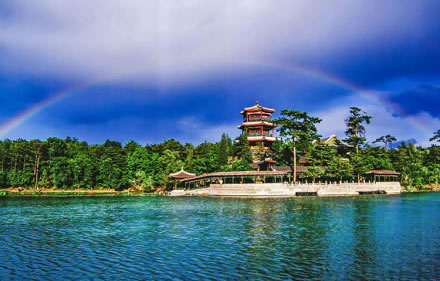湖泊區(qū):苑景區(qū)的精華基本上在湖泊區(qū),康熙曾夸耀說,“天然風(fēng)景勝西湖”。由于洲島錯落,湖面被長堤和洲島分割成5個湖,各湖之間又有橋相通,兩岸綠樹成蔭,山莊主要的風(fēng)景建筑又都散落在湖區(qū)的周圍,因此顯得曲折有致,秀麗多姿。湖泊區(qū)位于山莊東南,面積49.6萬平方米。有大小湖泊八處,即西湖、澄湖、如意泅、上湖、下湖、銀湖、鏡湖及半月湖,統(tǒng)稱為塞湖。 湖區(qū)的風(fēng)景建筑大多是仿照江南的名勝建造的,如“煙雨樓”,是模仿浙江嘉興南湖煙雨樓的形狀修的。金山島的布局仿自江蘇鎮(zhèn)江金山。湖中的兩個島分別有兩組建筑,一組叫“如意洲”,一組叫“月色江聲”。“如意洲”上有假山、涼亭、殿堂、廟宇、水池等建筑,布局巧妙,是風(fēng)景區(qū)的中心!霸律暋笔怯梢蛔碌乃暮显汉蛶鬃ぁ⑻媒M成。每當(dāng)月上東山的夜晚,蛟潔的月光,映照著平靜的湖水,山莊內(nèi)萬籟俱寂,只有湖水在輕拍堤岸,發(fā)出悅耳的聲音,“月色江聲”的題名便是由此而來。湖泊區(qū)集南方園林之秀和北方園林之雄,將江南園林的景觀移植到塞外。區(qū)內(nèi)湖泊總稱“塞湖”,總面積57公頃。
