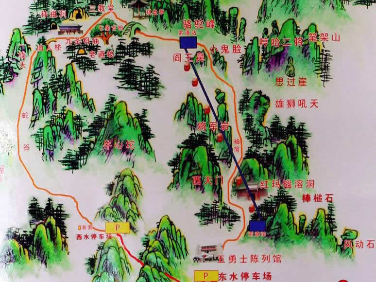 棋盤坨,為狼牙山的主要山峰之一,民國(guó)《易縣志稿》載:“棋盤坨在易縣西南95里,郎山(老君堂所在的褡褳峰)之西,高數(shù)里,四周高峰,一徑可入,上有石棋盤,又有三池,清泉不竭!臂绲撞坑形魉湮髂蟼(cè)的峨眉山、眾軍山,皆為古戰(zhàn)場(chǎng)。由西水寨攀登,可達(dá)西天門,徑路兩側(cè)山體如刀削斧劈,石筍如寶瓶。西天門附近,有紅瑪瑙巖溶洞,原名“天井”。過(guò)了西天門,多處奇峰、怪石、洞穴。如棒槌崖、黃羅傘、老虎洞、老虎嘴、飲虎池、相思谷、仙女泉、無(wú)底洞、鎮(zhèn)妖石,奇特的陰陽(yáng)石,陽(yáng)面似武將,陰面猶如仕女,當(dāng)?shù)厝朔Q“媳婦頭”。沿2900級(jí)登天梯石階,達(dá)棋盤坨,坨頂建狼牙山五壯士塔,塔西的小蓮花峰(小蓮花瓣),即五壯士跳崖處。坨西有胭脂湖。坨北有天險(xiǎn)閻王鼻子、小鬼臉。