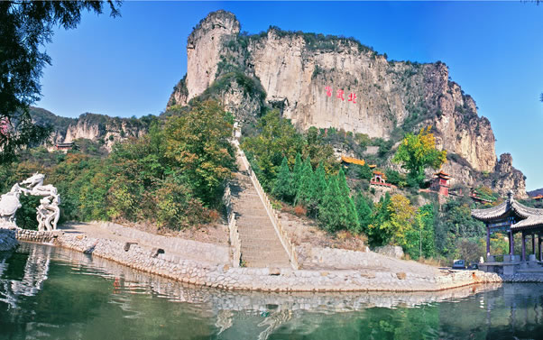 抱犢寨風(fēng)景名勝區(qū)是國(guó)家AAAA景區(qū),位于河北省石家莊市鹿泉市境內(nèi),距石家莊市16公里,距首都北京288公里。抱犢寨,舊名抱犢山,古名萆山,是一外集歷史人文和自然風(fēng)光為一體的名山古寨。它東臨華北平原,西接太行群巒,一峰突起,崢嶸雄秀,四周皆是懸崖絕壁,遠(yuǎn)望猶如巨佛仰臥,眉目畢肖。山頂平曠坦夷,有良田沃土660畝,土層深達(dá)66米,異境別開(kāi),草木繁茂,恍如世外桃源。有“天下奇寨”、“抱犢福地”、“全國(guó)最大山頂園林”等美譽(yù)。其景點(diǎn)均集中在寨頂平臺(tái)之上,有全國(guó)最大的山頂門(mén)坊南天門(mén)、道教宮觀金闕宮、全國(guó)最大的山頂?shù)叵率裎灏倭_漢堂、華夏第一龍壁千龍壁以及牛郎織女故事的發(fā)祥地——牛郎織女家、天池、天堂街、環(huán)山長(zhǎng)城等諸多景點(diǎn);公元前204年漢將韓信曾于此萆山設(shè)伏、背水一戰(zhàn)、大破趙軍,因而寨頂建有韓信點(diǎn)將臺(tái)和韓信祠。金末元初,金恒山公武仙曾于此山屯兵建寨,抗擊蒙古軍隊(duì)。在道教典籍中,該山被列為“北岳佐命”,明代著名道士張三豐也曾游歷此山,留下了“三豐派”一支脈,至今相傳不絕,宮觀猶存。近年來(lái),景區(qū)大力實(shí)施升級(jí)改造工程,重修了登山路;開(kāi)發(fā)建設(shè)了以音樂(lè)噴泉、讀月臺(tái)、天井飛瀑、彩虹谷、思凡亭等景點(diǎn)為主的鹿隱源生態(tài)新區(qū)。并增加了具有鮮明特色的少數(shù)民族歌舞演出,景區(qū)魅力倍增。