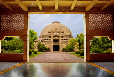 印度佛殿規(guī)劃占地6000平方米,建筑面積為3450平方米。主要建筑包括大佛殿、回廊、牌樓等,布局規(guī)整,別具匠心。大佛殿仿印度著名佛教遺址桑奇大塔建造。大佛殿中央供奉佛祖說(shuō)法像,表現(xiàn)佛陀在鹿野苑第一次說(shuō)法——說(shuō)四圣諦度五比丘的情景。頂部安裝有玻璃天窗,陽(yáng)光從天窗投射下去,照射在佛像周?chē)。大佛殿上下兩層塔身及殿門(mén)前牌坊上雕刻有佛本行故事與佛本生故事。大佛殿底部設(shè)計(jì)有水系。
