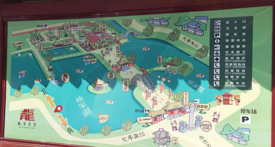 占地面積1300多畝,其中水域面積710畝。全園包括午門、玉帶橋、朝門、照壁、朝房、龍亭公園、北宋皇宮宸拱門遺址、碑亭、北門及東門等清朝萬壽宮建筑群體,還有潘楊二湖、春園、盆景園、號(hào)稱中原一絕的植物造型園及長廊水榭等園林景觀。龍亭公園大殿高26.7米,基高13米,坐北朝南。東西兩側(cè)各有八間朝房,與大殿組成完整的宮殿院落,其內(nèi)建有中國首座大型宋代蠟像館,63個(gè)人物蠟像形神兼?zhèn),栩栩如生。御道兩?cè)為著名的楊湖和潘湖。雖然兩湖東西相鄰,但楊湖清澈見底,恰似北宋名臣楊繼業(yè)的光明磊落,潘湖卻渾濁不堪,正如北宋奸臣潘美的卑鄙齷齪。整個(gè)園區(qū)既有北方宮殿雄渾之氣魄,又兼南國園林秀麗之風(fēng)姿。