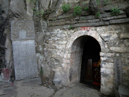 在少林寺背后五乳峰中峰上部有一天然石洞,為當(dāng)年達摩祖師九年面壁處,稱為達摩洞。禪宗初祖達摩于公元527年到536年在此洞面壁靜坐長達9年。達摩洞面向西南,洞口用青石塊砌成拱門,洞深約七米,高寬各三米余。洞內(nèi)臺上有石像三尊,中為達摩坐像,兩側(cè)為其弟子。