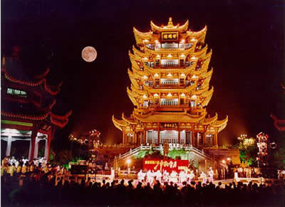 號稱江南三大名樓之一的黃鶴樓,原址在湖北武昌蛇山黃鶴磯頭,原為辛氏開設(shè)的酒店,一道士為了感謝她千杯之恩,臨行前在壁上畫了一只鶴,告之它能下來起舞助興。從此賓客盈門,生意興隆。過了十年,道士復(fù)來,取笛