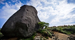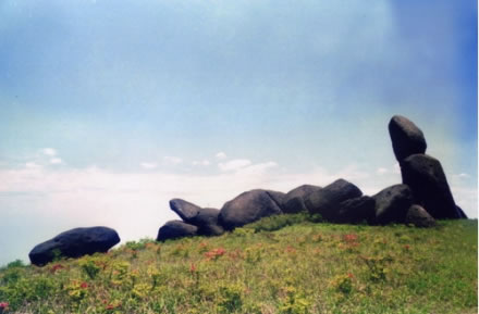 2、婦孺石:位于海拔1400米的茫茫草原之中,巍然挺拔,高約10米,上下由兩塊大小不等的石頭組成,遠(yuǎn)觀猶似一少婦,神態(tài)慈祥,悠然自在,懷抱其子,親切可人。故名。