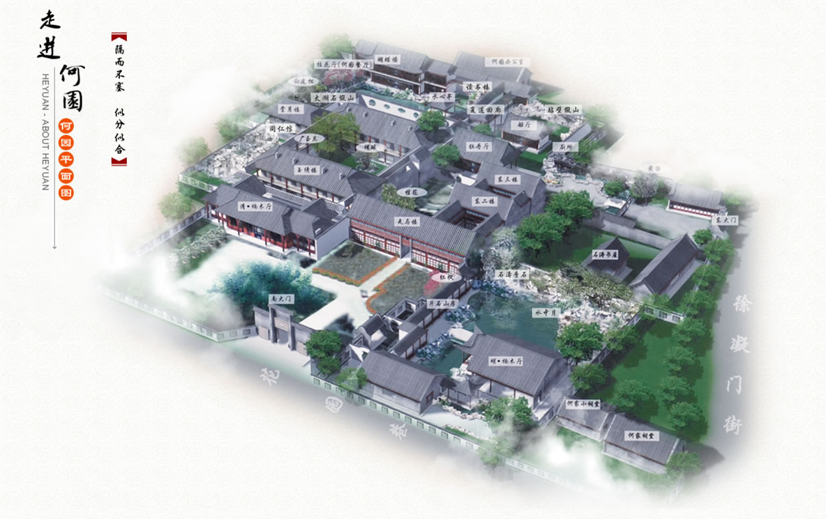 何園全園分為東園、西園、園居院落、片石山房四個部分,片石山房在東園南面,園居院落則被東園、西園和片石山房包圍,其園內(nèi)的兩層串樓和復(fù)廊與前面的住宅連成一體。