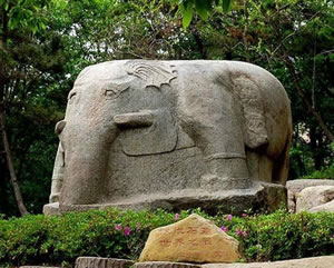 從龍洞西行,在林木掩映的山坡上.屹立著一座碩大的漢代圓雕石象。石象依一塊花崗巖巨石的自然形狀雕刻而成雕刻而成,象身高2.6米,長4.8米,背寬3.5米,石像耳闊體肥,四肢健壯,長鼻巨牙、卷尾粗足,形態(tài)雄奇,豐滿肥碩。象身西側(cè)有一高0.88米,寬0.49米,深0.2厘米的陰鑿凹面,系未見刻銘的題榜,象身東側(cè)以陰線刻一高1.13米,寬0.62米的方框,內(nèi)刻隸書“象石”字樣,在刻銘與象前腿之間,還鑿刻了一個頭梳“丁”字形發(fā)髻,手持勾鞭,腳帶鐐銬高0.92米的馴象奴。象的四足均踏著蓮花,體現(xiàn)了佛教中六牙白象王在水中步步蓮花的故事傳說。它是孔望山漢代佛教造像有機整體中不可分割的一部分。此石系目前我國發(fā)現(xiàn)的東漢時期最大的圓雕石刻,石象南側(cè)約一百五十米處,還有與此同時期的石雕鎮(zhèn)海蛙,此蛙為當時鎮(zhèn)海之物。體長240厘米,寬220厘米,通高110厘米,石蛙頭部略損,前兩肢半殘,眼睛陰刻,背上遍刻陰線鱗紋。這兩座石雕,別特是石象,氣勢雄偉,造型精美。均為我國珍貴的石刻藝術珍品。