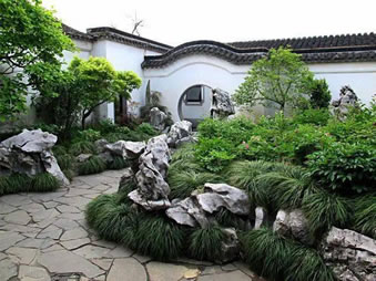 網(wǎng)師園正門前設(shè)照墻,大門兩旁置抱鼓石,抱鼓石上飾獅子滾繡球浮雕,額枋上裝有閥閱,大門格局足以顯示園主門第高貴。