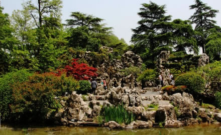 假山瀑布位于環(huán)洲南端。1992年列為南京市文物保護單位。眾多的太湖假山石堆砌成了形態(tài)各異的園林佳作,它們或似蒼鷹展翅,或似猿猴嘯天,或似禽棲獸踞。綠化層次感和色彩感非常美麗和諧。