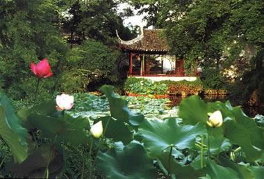 ( 4)園林景觀,花木為勝。拙政園向以“林木絕勝”著稱。數(shù)百年來一脈相承,沿襲不衰。早期王氏拙政園三十一景中,三分之二景觀取自植物題材,如桃花片,“夾岸植桃,花時望若紅霞”;竹澗,“夾澗美竹千挺”,“境特幽回”;瑤圃百本,花時燦若瑤華!睔w田園居也是叢桂參差,垂柳拂地,“林木茂密,石蘚然”。每至春日,山茶如火,玉蘭如雪。杏花盛開,“遮映落霞迷澗壑”。夏日之荷。秋日之木芙蓉,如錦帳重疊。冬日老梅偃仰屈曲,獨傲冰霜。有泛紅軒、至梅亭、竹香廊、竹郵、紫藤塢、奪花漳澗等景觀。至今,拙政園仍然保持了以植物景觀取勝的傳統(tǒng),荷花、山茶、杜鵑為著名的三大特色花卉。僅中部二十三處景觀,百分之八十是以植物為主景的景觀。如遠香堂、荷風四面亭的荷(“香遠益清”,“荷風來四面”);倚玉軒、玲瓏館的竹(“倚楹碧玉萬竿長”,“月光穿竹翠玲瓏”);待霜亭的桔(“洞庭須待滿林霜”);聽雨軒的竹、荷、芭蕉(“聽雨入秋竹”,“蕉葉半黃荷葉碧,兩家秋雨一家聲”);玉蘭堂的玉蘭(“此生當如玉蘭潔”);雪香云蔚亭的梅(“遙知不是雪,為有暗香來”);聽松風處的松(“風入寒松聲自古”),以及海棠春塢的海棠,柳陰路曲的柳,批把園、嘉實亭的批把,得真亭的松、竹、柏等等。