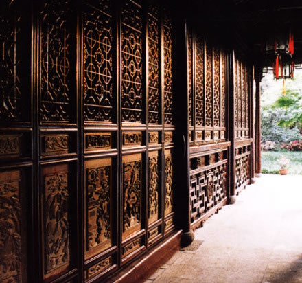 秫香館:秫香,指稻谷飄香。此處以前墻外皆為農(nóng)田,豐收季節(jié),秋風送來一陣陣稻谷的清香,令人心醉,館亦因此得名。秫香館為東部的主體建筑,面水隔山,室內(nèi)寬敞明亮,長窗裙板上的黃楊木雕,共有48幅,雕鏤精細,層次豐富,栩栩如生。落地長窗加上精致的裙板木雕,把秫香館妝點得古樸雅致,別有情趣。