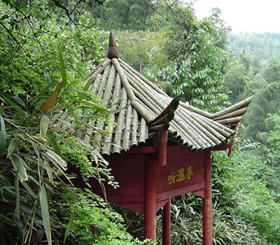 迎笑堂在寺后峰上,不知建于何年,堂內(nèi)以多首題壁詩而名聞于世。唐朝以來,先后有劉禹錫、牟融、曹松、歐陽持、岳飛等名人題詩于壁。堂前有九節(jié)筇、千隼橘、鶴良松。妙高臺,臺在寺前,北宋無盡居士張商英(尚書右仆射)游寺,寺僧保寧國鞏迎于半途,二人問答組成了一首好詩,后題刻地妙高臺上;廴诖笮蹖毜詈竺,泉從地下裂隙中冒出,由于地下氣體上逸,使泉水有規(guī)律地發(fā)出"咕、咕"聲。泉水清沏見底,口感微甜,是上好的礦泉水。泉上建有'真源亭",亭柱上鐫對聯(lián):"慧燈常明照見五蘊皆空,泉水澄清洗滌不凈塵勞。"