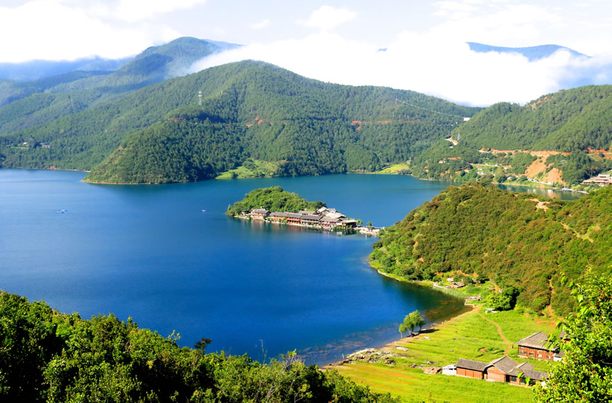 麗江瀘沽湖摩梭文化旅游區(qū),地處麗江市寧蒗縣永寧鄉(xiāng)與四川省鹽源縣左所鄉(xiāng)交界處,是摩梭族人的主要聚居地,素有“高原明珠”之稱,是云南省九大高原湖泊之一。行政區(qū)劃上,瀘沽湖隸屬四川省鹽源縣和云南省寧蒗縣共同管轄,其中四川省鹽源縣管轄東部的29.6平方千米(含沼澤濕地5.8平方千米),云南省寧蒗縣管轄西部的27.0平方千米。瀘沽湖,在地貌區(qū)劃上屬橫斷山系切割山地峽谷區(qū),橫斷山北段高山峽谷亞區(qū)和滇東盆地山原區(qū),滇西北中山山源亞區(qū)交界地帶。瀘沽湖湖岸多彎曲,形成深淵的小港灣,湖中有大小島嶼七個,都是石灰?guī)r殘丘。沿湖東部湖底有長形深槽,北部和長島兩側的湖坡陡峻。湖北面有獅子山,東北面有肖家火山,西南為狗鉆洞山地。