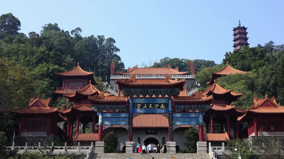 廣州南沙天后宮,又叫“媽祖廟”,位于廣東省廣州市南沙區(qū)天后路88號,坐落于大角山東南麓,地處粵港澳大灣區(qū)之心,瀕臨珠江出?诘牧尕暄螅嫉孛娣e達(dá)18萬平方米。廣州南沙天后宮前身是明代建于鹿頸村的天妃古廟,清乾隆年間經(jīng)重修定名為元君古廟,抗戰(zhàn)時期被日寇飛機(jī)炸毀,而后于1994年重建。廣州南沙天后宮是為紀(jì)念海上女神林默而建,是一個以媽祖文化為主題的景區(qū),是粵港澳大灣區(qū)媽祖文化交流中心,亦是東南亞最大之媽祖廟。廣州南沙天后宮采用清式建筑對稱布局,高低錯落地依山而建,建筑的特點集北京故宮的風(fēng)格和南京中山陵的氣勢于一體,規(guī)模為現(xiàn)今世界同類建筑之最。廣州南沙天后宮由廣場、宮殿和南嶺塔三部分構(gòu)成,“天后八景”包括:濱海銀灘朝陽、五彩靈徑、媽祖靈釵、“南沙人”遺址、靈宮賜福、南嶺夕照、抗戰(zhàn)神炮、默娘之家八個景點。