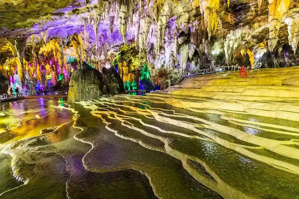 - 核心特色:洞內(nèi)分四層結(jié)構(gòu),已開放第二層約2公里游覽線,包含五大主題廳——吉星迎賓、壯鄉(xiāng)聽海、云山鑒水、詩畫田園、幽靜奇觀。景觀涵蓋鈣華池梯田、神象賜福、天下第一鐘等1000余處天然獨立景觀,其中鈣華池群面積達6000平方米,黑白對比形成獨特視覺奇觀。