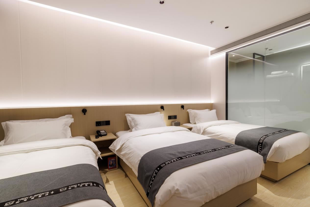 創(chuàng)電競智慧酒店3.0(北京房山良鄉(xiāng)大學城店)酒店房型種類豐富,配備了電競大床房、電競雙床房、電競?cè)碎g、電競四人間、電競五人間等不同房型,共計70個房間,最多可容納 161人。無論是獨俠競技、閨蜜體驗、情侶暢玩、還是兄弟開黑,創(chuàng)電競都能滿足需求。
